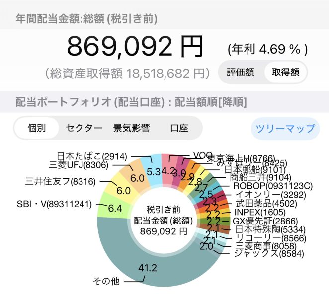 配当目的で集めた日本株等の、年間配当予定が 869,092円 になりました。
